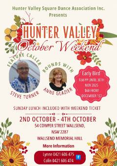 Hunter Valley Square Dance Society HUNTER VALLEY OCTOBER WEEKEND Wallsend Memorial Hall, 54 Cowper Street Wallsend, NSW 2287 Feature Caller Steve Turner Rounds with Anne Glazier Early Bird $50 pp until 30th Nov 2025 $60 from December 1st Sunday lunch included with weekend ticket Registration form (237KB PDF) Contact: Lynne ph: 0421 606 475 Colin ph: 0421 606 474 |