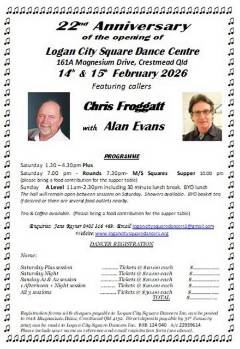 Logan City Square Dancers 22ND ANNIVERSARY 22nd Anniversary of the opening of Logan City Square Dance Centre, 161A Magnesium Drive, Crestmead Qld Featuring callers Chris Froggatt with Alan Evans Saturday 1.30 - 4.30 pm Plus Saturday 7.00 pm - Rounds, 7.30pm - M/S Squares, Supper 10.00 pm (please bring a tood contribution for the supper tabic) Sunday A level 11am-2.30pm including 30 minute lunch break. BYO lunch The hall will remain open between sessions on Saturday. Showers avallable. BYO basket tea if desired or there are several food outlets nearby. Tea & Coffee available. Website Contact: Jane ph: 0405 316 469 |