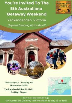 Victorian Square Dance Association 55TH VICTORIAN STATE CONVENTION Beechworth Memorial Hall, 101 Ford Street, Beechworth, VIC (approximately 3-4 hours NE of Melbourne) Theme - Rebels And Outlaws Early bird Adult price is $75 for V.S.D.A members AND Interstate Dancers! Register before the 1st of December 2025 for this discount, after which it will be $85. Registrations for Victorians who aren't V.S.D.A members are priced at $90 for early bird and $100 afterwards. Website Contact: Ph: 0407 325 194 Registration Form |