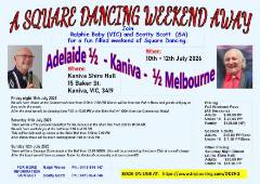 KANIVA WEEKEND AWAY Join Ralphie Baby (VIC) and Scotty Scott (SA) for a fun filled weekend of Square Dancing. Kaniva Shire Hall, 15 Baker St, Kaniva VIC 3419 Friday night 10th July 2026 We will have dinner at the Commercial Hotel from 5:30 to 7:00 PM. Dinner will be from the Pub's Menu and guests will pay as they order the meals. After the meal we will be dancing from 7:30 to 10:00 PM at the Shire Hall (+/-400m from the Commercial Hotel) Saturday 11th July 2026 There will be a free pancake breakfast for the dancers at the Shire Hall from 9:00 to 10:30 AM. We will have workshops at the hall from 2:00 to 4:30 PM. This will be followed by dinner at the Shire Hall from 5:00 to 7:00 PM. After dinner there will be more dancing from 7:00 to 10:30 PM. Sunday 12th July 2026 There will be a Sausage Sizzle lunch at the Hall from 12:00 NOON. This will be provided by the Lions Club at a small charge. After the lunch we will have a Learner Taster for the local community and also some MS. Pricing: Full Weekend Pass (All Sessions) Adults $40.00 PP, Under 18 $20.00 PP, Family $120.00 (4P) Session Tickets Adults $15.00 PP/Session, Under 18 $7.50 PP/Session Other Pricing: Saturday Night Dinner (at the Shire Hall) Adults $30.00 PP, Under 18 $15.00 PP Book Online Contact: Ralph Weise ph: 0419 514 147 Scotty Scott ph: 0419 864 748 |