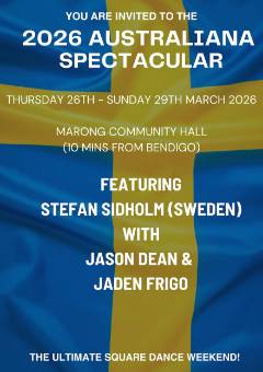 Australiana Dancers 2026 AUSTRALIANA SPECTACULAR Marong Community Hall (10 mins from Bendigo) Featuring Stefan Sidholm (Sweden) with Jason Dean & Jaden Frigo The Ultimate Square Dance Weekend! Weekend Format Thursday Night Trail In Dance - M/S, some Plus & Rounds (Free With Your Weekend Ticket) Friday Afternoon - M/S, Plus & A Friday Night - M/S & Rounds Saturday Morning/Afternoon - M/S, Plus & A Saturday Night - M/S & Rounds Sunday Morning (Til 1.00) - M/S and some Plus Registration Form (582KB PDF) Contact: Jaden Frigo ph: 0400 878 259 |