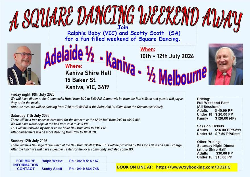| KANIVA WEEKEND AWAY Join Ralphie Baby (VIC) and Scotty Scott (SA) for a fun filled weekend of Square Dancing. Kaniva Shire Hall, 15 Baker St, Kaniva VIC 3419 Friday night 10th July 2026 We will have dinner at the Commercial Hotel from 5:30 to 7:00 PM. Dinner will be from the Pub's Menu and guests will pay as they order the meals. After the meal we will be dancing from 7:30 to 10:00 PM at the Shire Hall (+/-400m from the Commercial Hotel) Saturday 11th July 2026 There will be a free pancake breakfast for the dancers at the Shire Hall from 9:00 to 10:30 AM. We will have workshops at the hall from 2:00 to 4:30 PM. This will be followed by dinner at the Shire Hall from 5:00 to 7:00 PM. After dinner there will be more dancing from 7:00 to 10:30 PM. Sunday 12th July 2026 There will be a Sausage Sizzle lunch at the Hall from 12:00 NOON. This will be provided by the Lions Club at a small charge. After the lunch we will have a Learner Taster for the local community and also some MS. Pricing: Full Weekend Pass (All Sessions) Adults $40.00 PP, Under 18 $20.00 PP, Family $120.00 (4P) Session Tickets Adults $15.00 PP/Session, Under 18 $7.50 PP/Session Other Pricing: Saturday Night Dinner (at the Shire Hall) Adults $30.00 PP, Under 18 $15.00 PP Book Online Contact: Ralph Weise ph: 0419 514 147 Scotty Scott ph: 0419 864 748 |