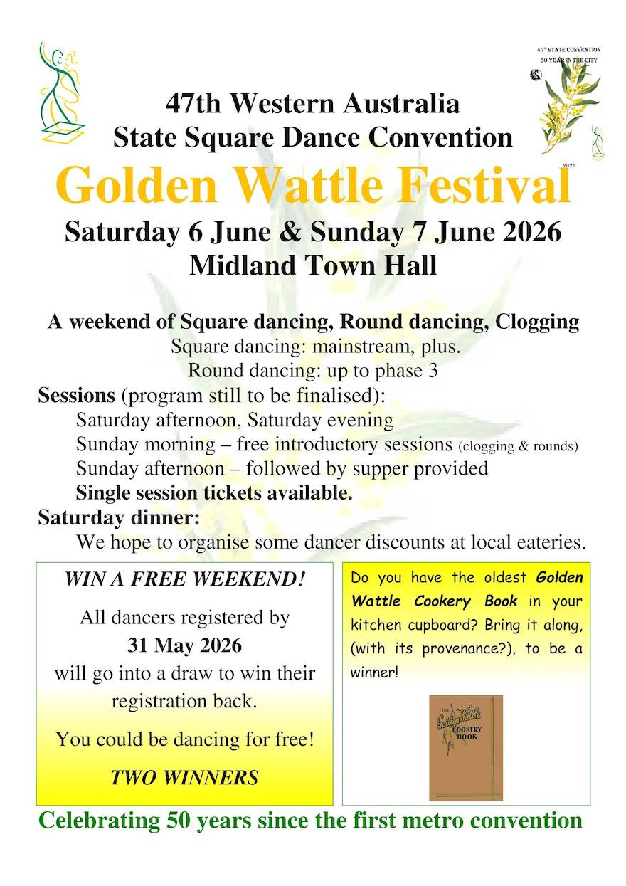 | GOLDEN WATTLE FESTIVAL - 47TH WESTERN AUSTRALIA STATE SQUARE DANCE CONVENTION A weekend of Square dancing, Round dancing, Clogging Square dancing: mainstream, plus. Round dancing: up to phase 3 Sessions (program still to be finalised): Saturday afternoon, Saturday evening Sunday morning - free introductory sessions (clogging & rounds) Sunday afternoon - followed by supper provided Single session tickets available. Saturday dinner: We hope to organise some dancer discounts at local eateries. Celebrating 50 years since the first metro convention Registration form (844KB PDF) |